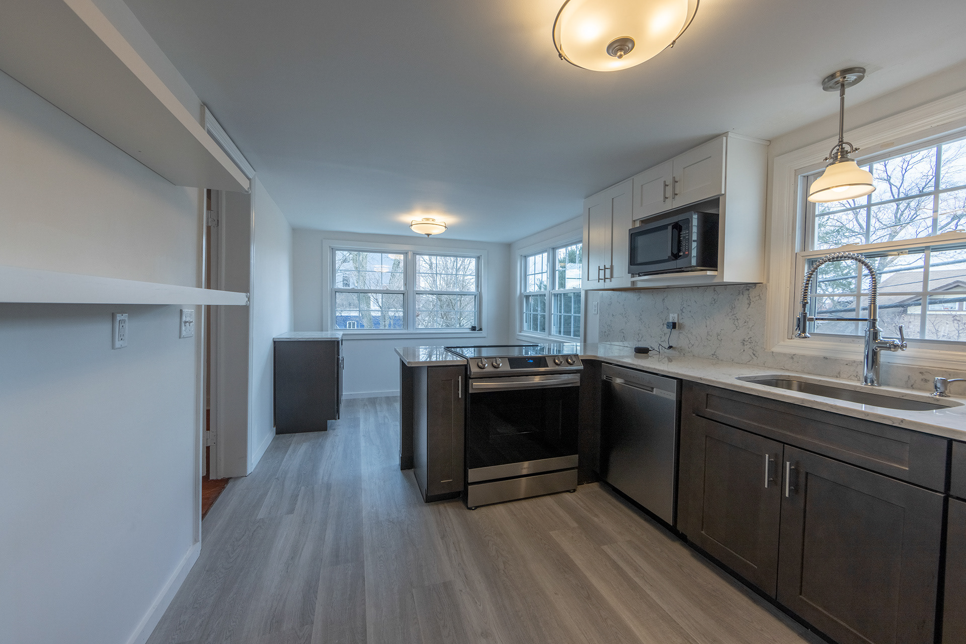 • Beautiful kitchen with stainless steel range, microwave, dishwasher, and refrigerator. Quartz counters. Eat-in area.
